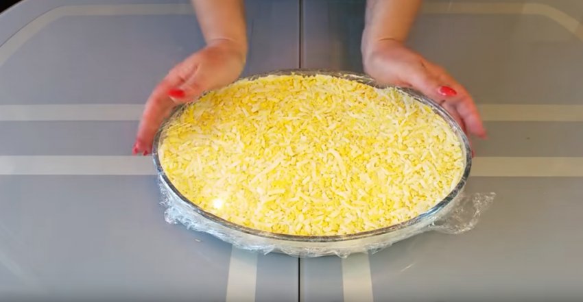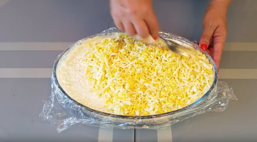Останній пласт складається з відвареної і дрібно нарубаної яєчної маси, яку теж варто щільно утрамбувати.![]()