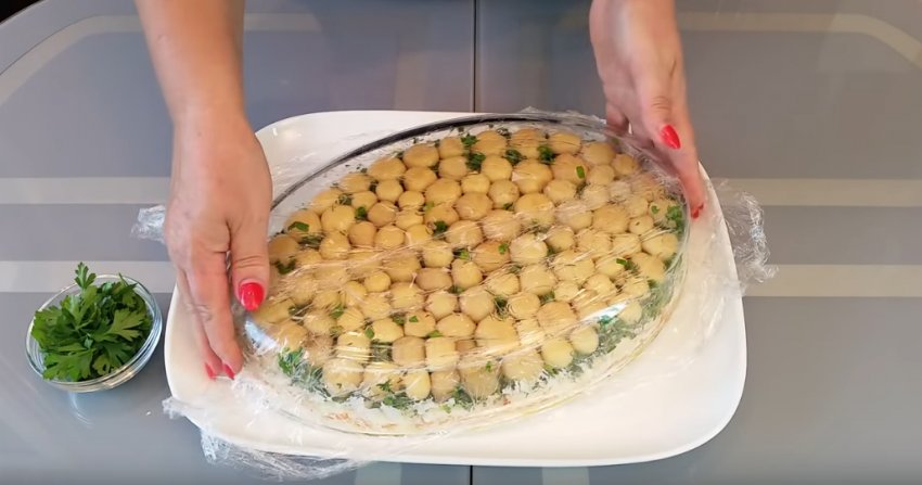 Після закінчення зазначеного часу зняти харчову плівку з форми, накрити останню стравою, на якій планується подавати салат.![]()