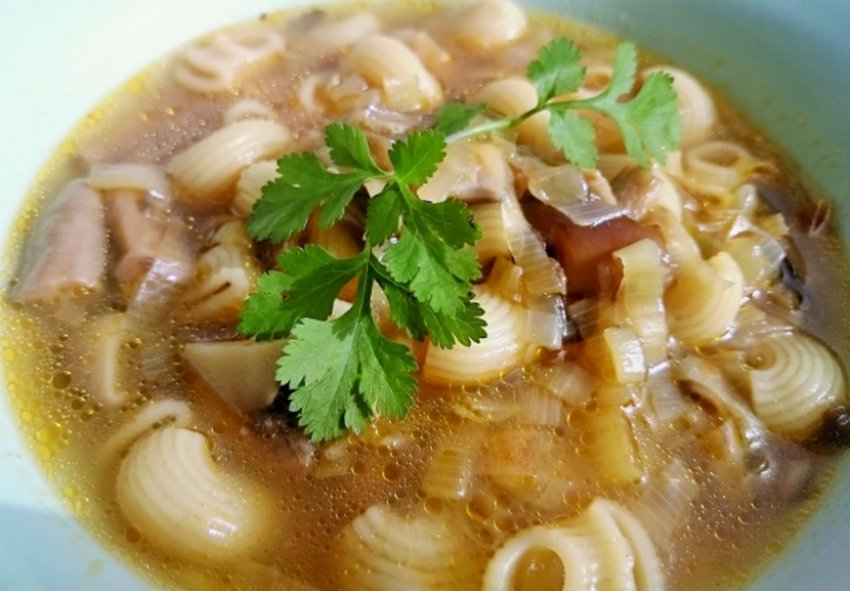- Через 20 хвилин у суп, що закипів, насипайте макарони. Варіть суп доти, доки картопля не стане готовою, для макаронних виробів додайте ще 7-10 хвилин варіння, керуючись інструкцією на упаковці.