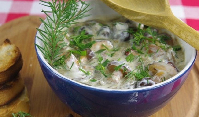- Готову грибницю розлийте по тарілках, присипте зеленню, прикрасьте ложкою сметани кожну порцію.