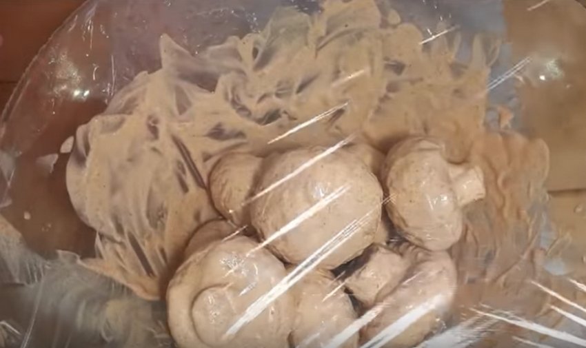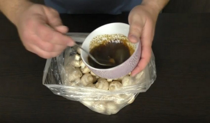 Цілі печериці перекласти в поліетиленовий пакет і туди ж залити маринад. Зав'язавши пакет, гриби можна перемішувати, рівномірно розподіляючи маринад.![]()