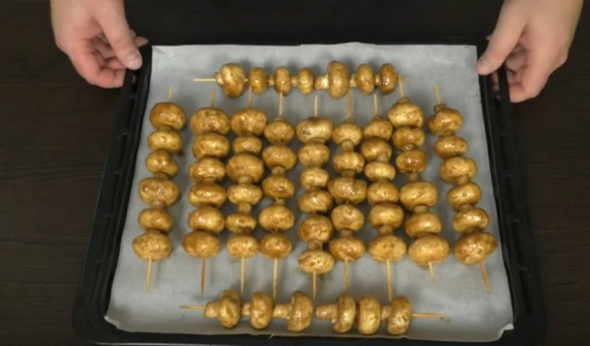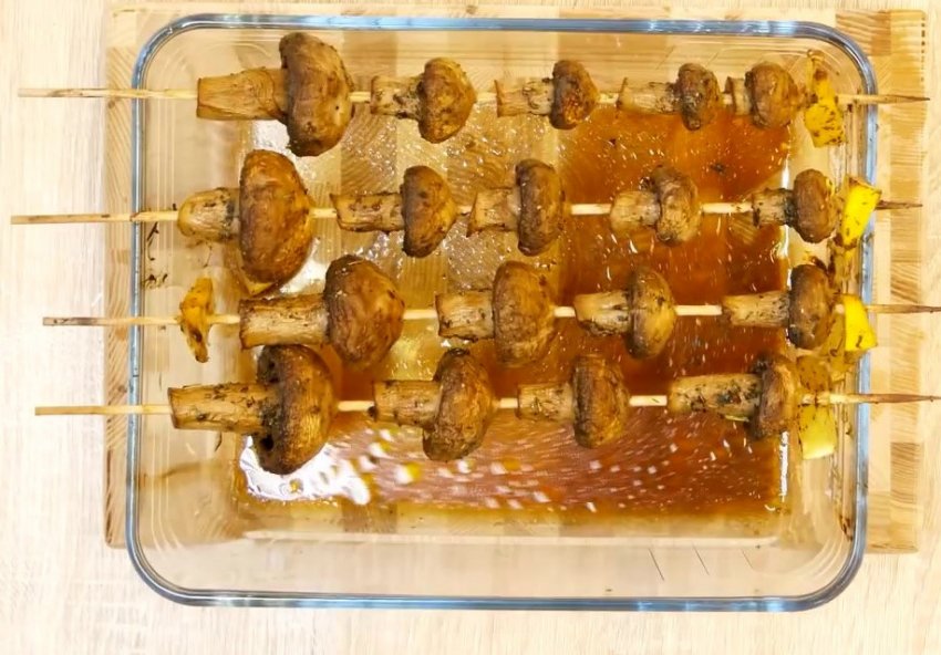 Гриби потрібно акуратно нанизати на дерев'яні шампура і викласти у форму. Бажано, щоб гриби не торкалися дна ємності для запікання - так збережеться цілісність плодового тіла.![]()