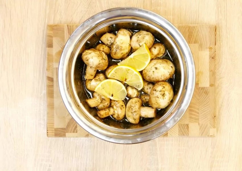 Підготовлені печериці необхідно змішати з маринадом і зверху покласти 3-4 скибочки лимона. Залишити гриби маринуватися протягом 30 хвилин.![]()