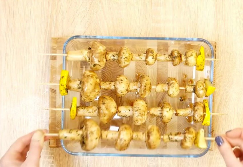 Промариновані плодові тіла і лимон нанизати на бамбукові палички і викласти шашлики на форму.![]()