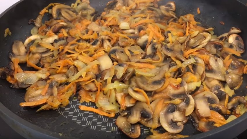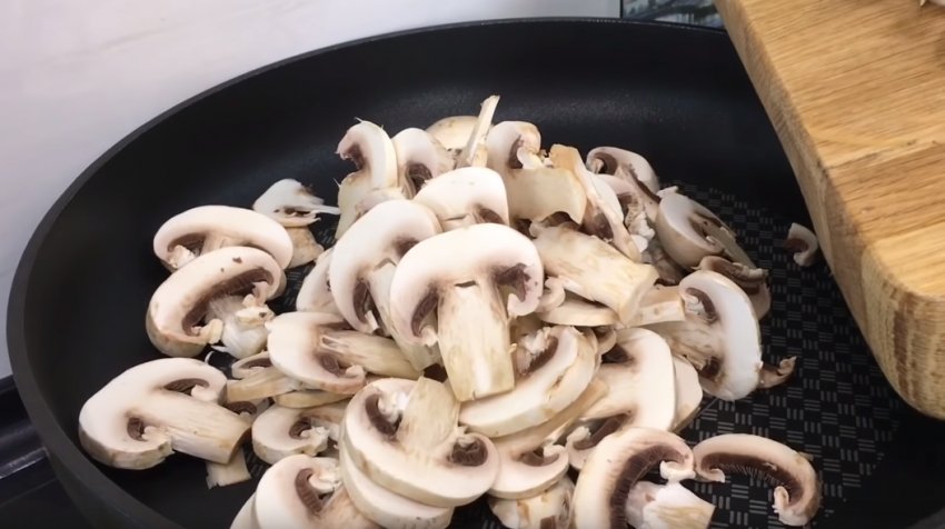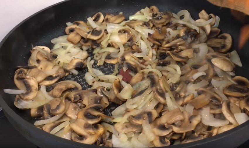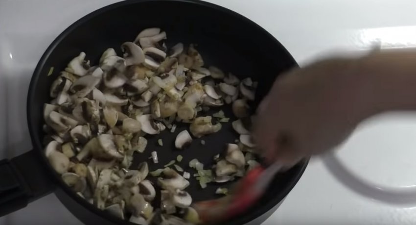 Відправити на пательню цибулю, а коли вона набуде золотистого кольору і м'якшої текстури, додати гриби. Смажити, постійно помішуючи, протягом 5 хвилин.![]()