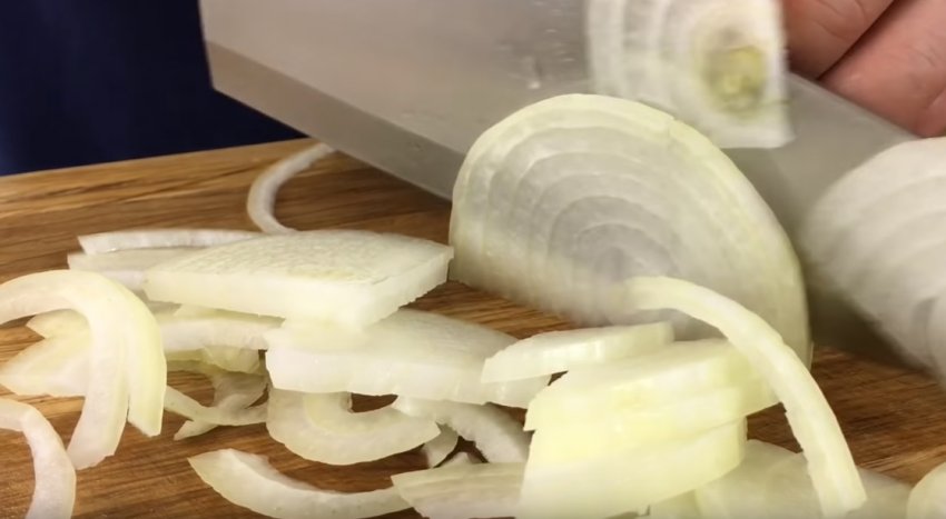 У цей час поділити цибулю на чотири частини і дрібно нашаткувати.![]()