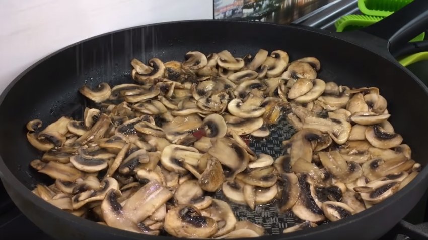 Після того, як рідина, що виділяється печерицями, розчинилася, додати кілька столових ложок олії, посолити і поперчити. Перемішати.![]()