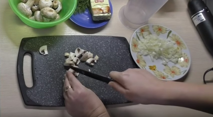 Цибулину нарізати дрібними кубиками, відкласти на тарілку. Печериці порізати навпіл, а потім подрібнити будь-яким зручним способом.![]()