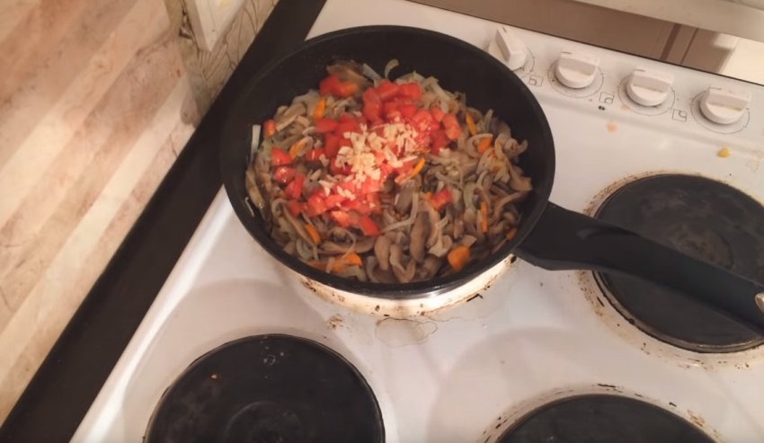 На добре розігрітій пательні обсмажити цибулю до золотистого кольору і відправити до неї моркву. Щойно вона протушкується, додати гриби і кубиками нарізані помідори. Дати заправці дійти під кришкою 4-5 хвилин.![]()