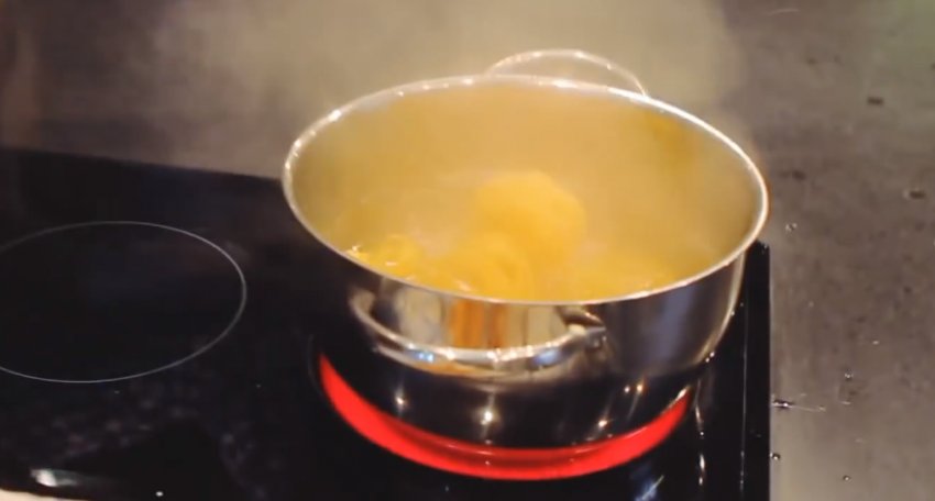 - Довести до кипіння велику каструлю з водою на сильному вогні. Посолити і відварити в ній пасту.