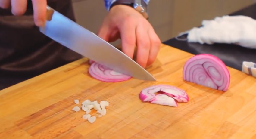 Очищений часник нарізати дрібними кубиками. Нарізати очищену цибулю півкільцями.![]()