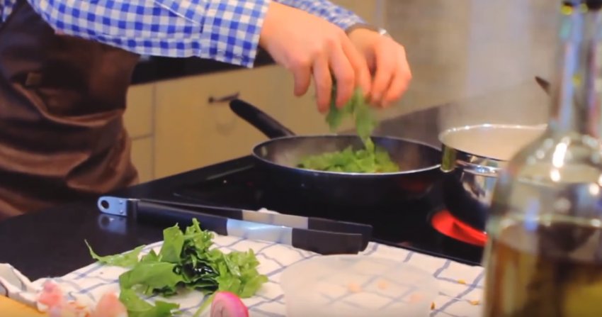 Розігріти сковороду. Обсмажувати очищені гриби в оливковій олії. Додати до них цибулю та часник. Додати до грибів 20 г вершкового масла.![]()