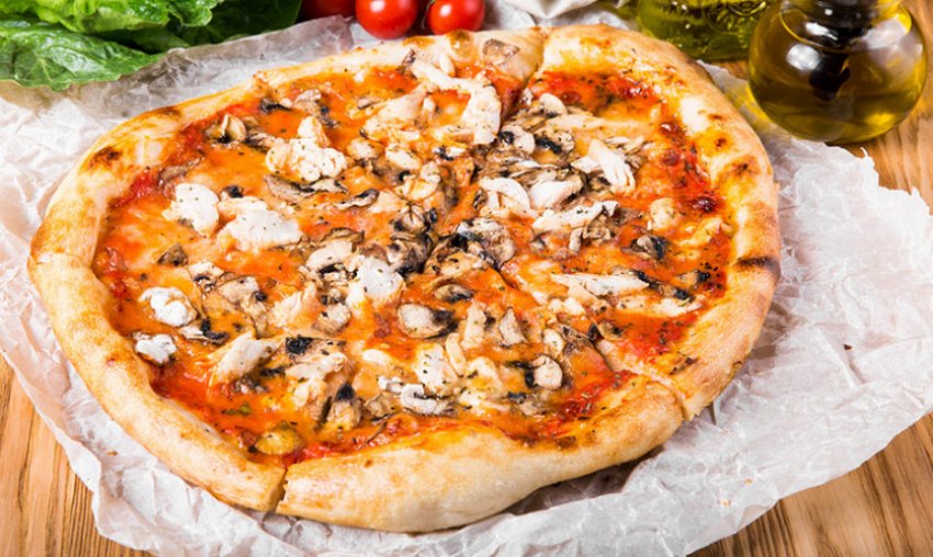- Подавайте класичну піцу з куркою і грибами на стіл, поки вона ще тепла, і сир не застиг.