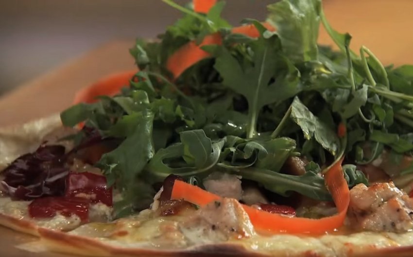 У центр піци викладіть салатний мікс з руколою і морквою, додайте зовсім небагато рослинної олії... Ось і все, апетитна піца з індичкою і свіжим салатом готова. Можна пробувати!![]()