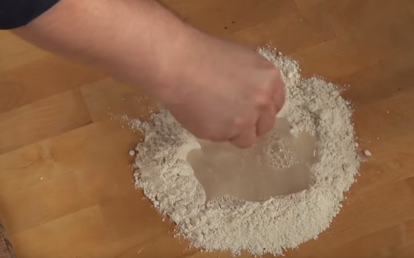 - Висипте борошно, що залишилося, на робочу поверхню у вигляді гірки, а в центрі зробіть заглиблення і всипте туди сіль. Зверху влийте опару.