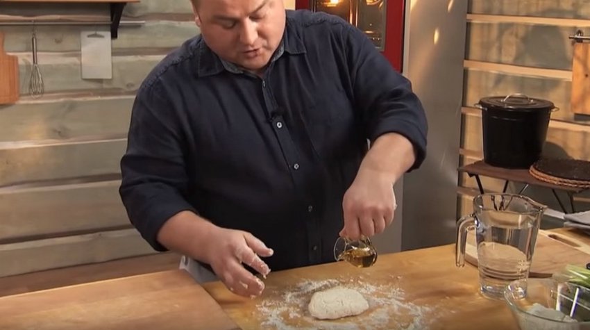 - Починайте вимішувати тісто. Поки воно липке, влийте оливкову олію і продовжуйте місити до м'якості та однорідності.