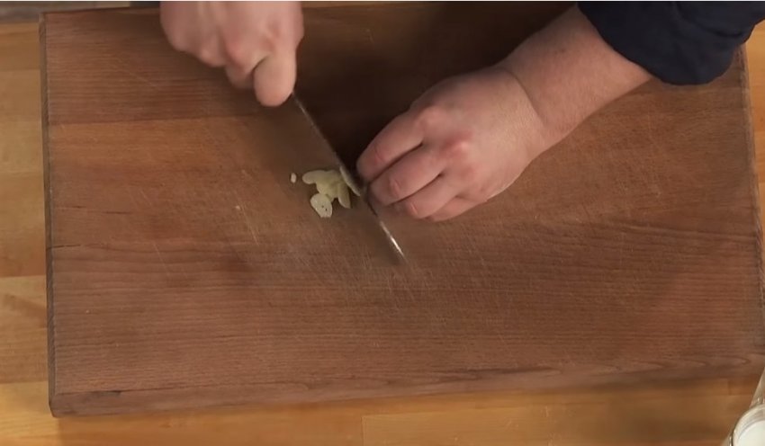 Звільніть від лушпиння часник, помийте, обсушіть і дрібно наріжте гострим ножем. Як альтернативу можна використовувати тертку або часникодавку.![]()