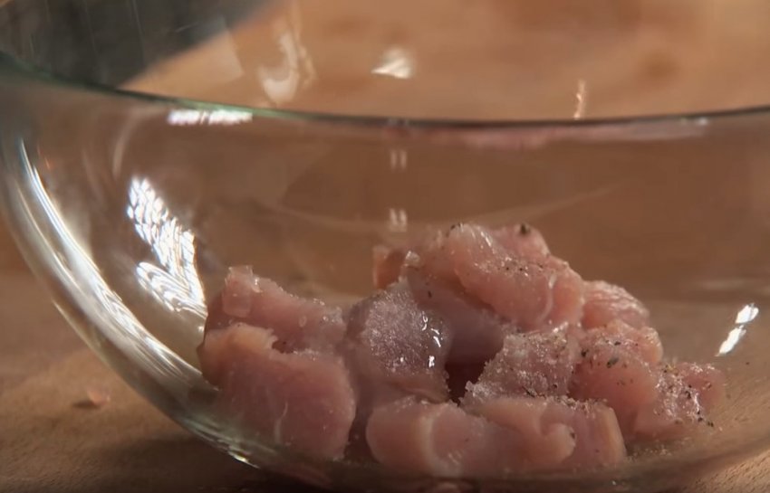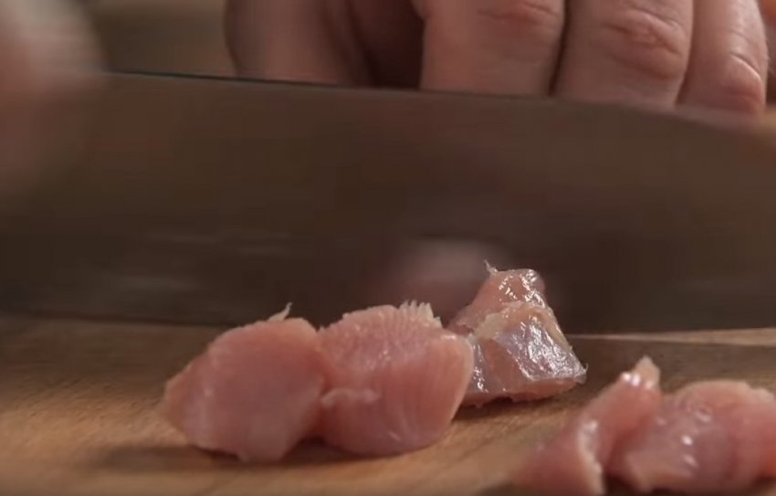 Наріжте обмиту й обсушену індичку невеликими кубиками. Обсмажувати або відварювати заздалегідь не потрібно, щоб м'ясо не стало сухим.![]()