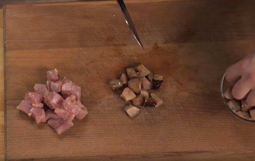 Білі гриби почистіть, помийте та обсушіть, якщо використовуєте свіжі. Замороженим потрібно дати розморозитися, а сухі вимочують у молоці або воді. Обраний продукт потрібно нарізати кубиками і викласти в невелику миску. Туди ж додайте трохи соєвого соусу і перемішайте. Залиште гриби на 5-7 хвилин, щоб вони просочилися і стали більш ароматними.![]()