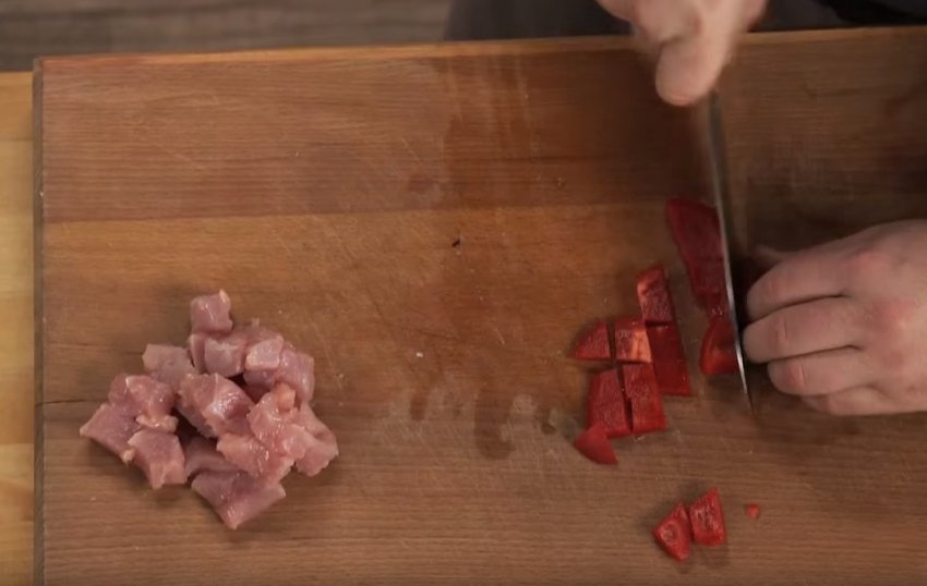 Помийте і обсушіть солодкий перець. Видаліть насіння і плодоніжку. Перець наріжте середніми шматками і викладіть в окрему миску.![]()