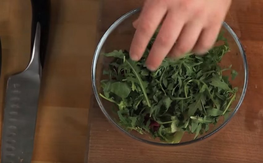 Візьміть миску і викладіть туди вимиту і обсушену салатну суміш і руколу.![]()