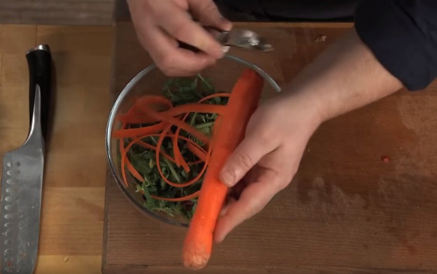 Моркву помийте, очистіть від шкірки, а потім за допомогою спеціальної овочечистки наріжте 5-7 смужок цього овоча. Можна скористатися гострим ножем, але діяти потрібно акуратно, щоб слайси вийшли дуже тоненькими. Відправте смужки до салату та руколи.![]()