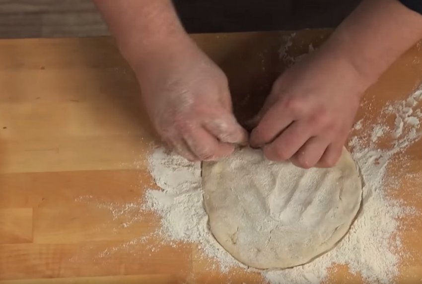 - Просійте пшеничне борошно (для насичення киснем) на стіл, змішайте з невеликою кількістю солі. Сухі інгредієнти зберіть гіркою, залишивши на робочій поверхні, а в центрі зробіть невелике заглиблення. Туди вилийте теплу воду і додайте олію (2-3 ч. л.). Потім вимісіть тісто так, щоб воно було пластичним і м'яким. Отриману масу скачайте в кулю, покладіть у тепле місце, попередньо вкривши бавовняною тканиною. У такому вигляді тісто потрібно залишити на 1 годину, щоб воно підійшло.