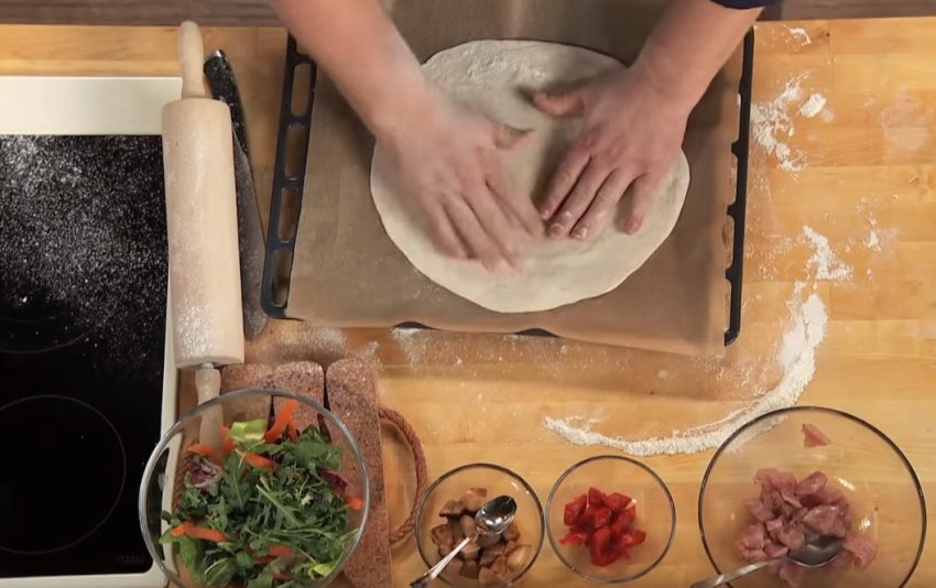 - Коли тісто підійде, розкачайте його в коло завтовшки до 0,5 см. Потім викладіть на деко, змащене олією або встелене пергаментом.