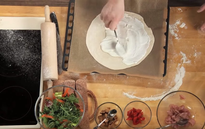 - Після закінчення зазначеного часу розкачайте тісто за допомогою качалки або розтягніть руками так, щоб вийшов круглий пласт завтовшки до 1 см. Зверху змастіть корж томатним соусом, розподіляючи його по всій поверхні.
