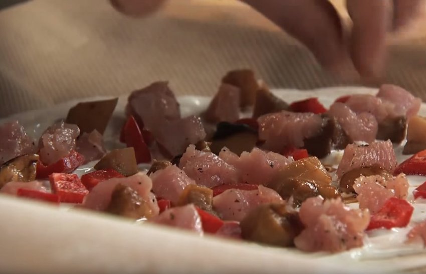 - Зверху викладіть гриби, шинку та цибулю. Потім присипте тертим сиром (чудово підходить пармезан) і відправте в духовку випікатися за температури +180°С протягом 25 хвилин.