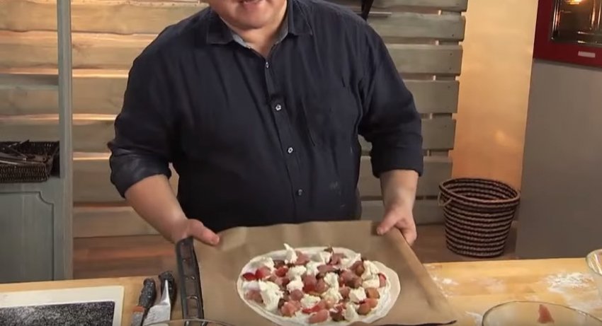 - Тісто розкачайте у велике коло, злегка загнув краї так, щоб вийшли борти. Покладіть його на деко, попередньо застелене пергаментом.