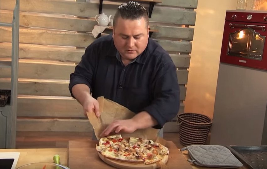 За допомогою пергаменту акуратно перемістіть піцу на робочу поверхню і розріжте, використовуючи спеціальний круглий ніж для піци, на необхідну кількість скибочок.![]()
