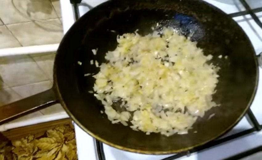- Нашаткувати цибулю, смажити до золотого відтінку 7 хвилин.