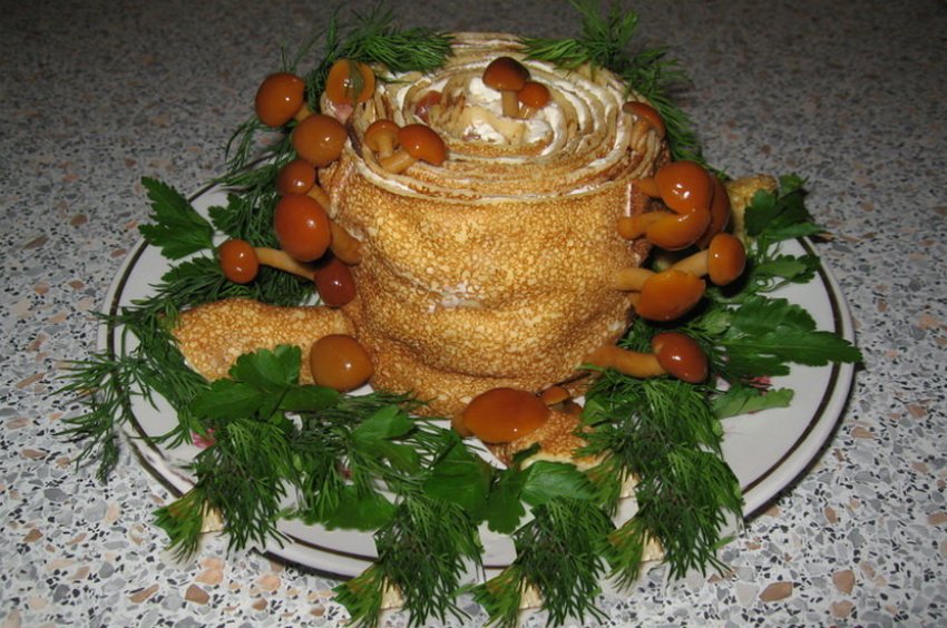 - Зверху прикрасити невеликими опеньками та листям базиліку.