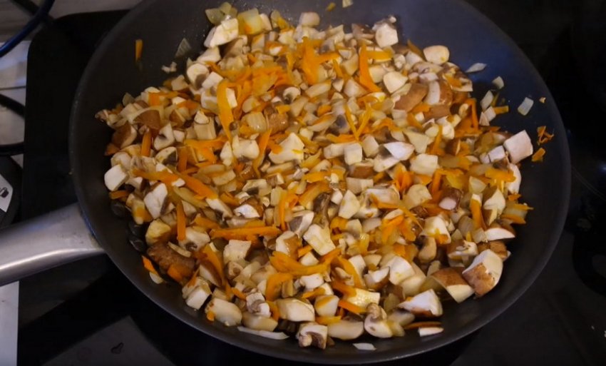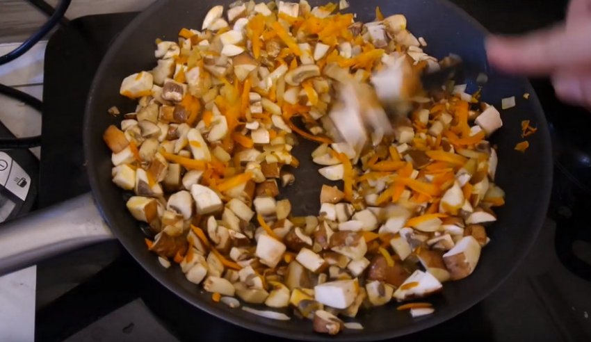 На розігріту пательню викласти цибулю, моркву і печериці. Просмажити протягом 5 хвилин на середньому вогні.![]()