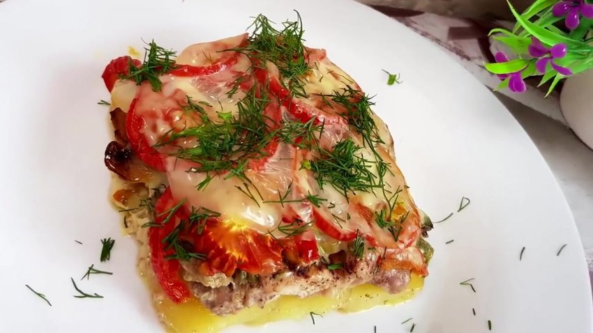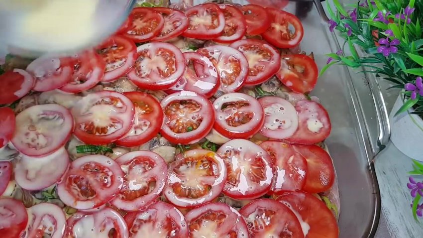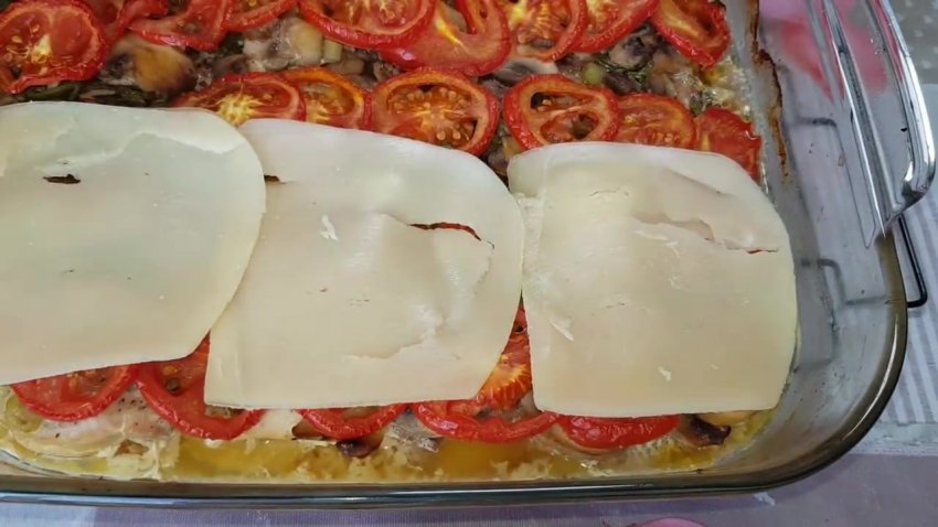 На деко по черзі шарами викласти картоплю (трохи підсолити), філе (посолити і додати спеції), потім зелень, смажені гриби, помідори і наприкінці залити все молоком з куркумою, зверху накрити фольгою![]()