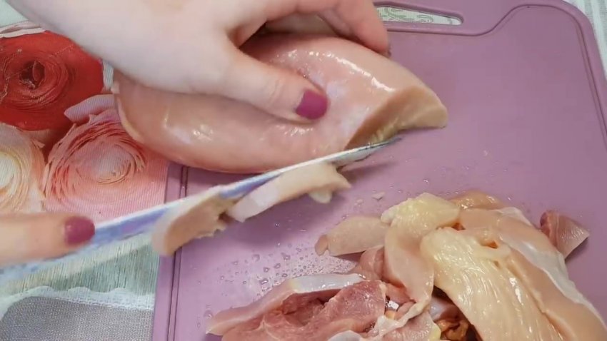 Філе нарізати дрібними скибочками.![]()