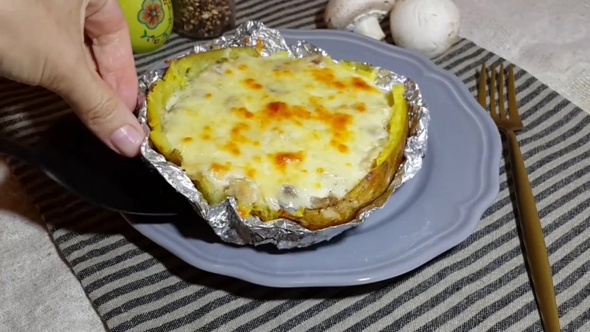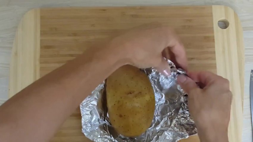 Картоплю, не виймаючи з фольги, розрізати навпіл, виделкою розчавити на пюре внутрішню частину, посолити і покласти шматочок вершкового масла, перемішати.![]()