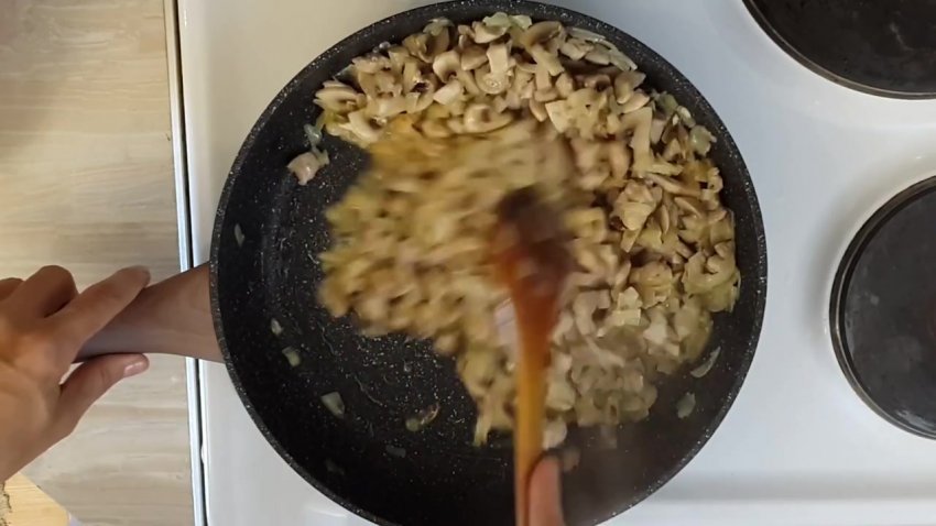 - Додати м'ясо з грибами, все обсмажити до золотистої скоринки.