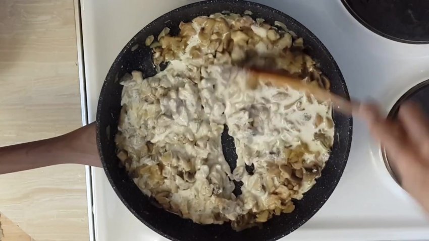 - Додати сіль і спеції, влити сметану, перемішати.