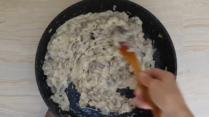Зняти з плити і додати 50 г тертої моцарели, перемішати.![]()