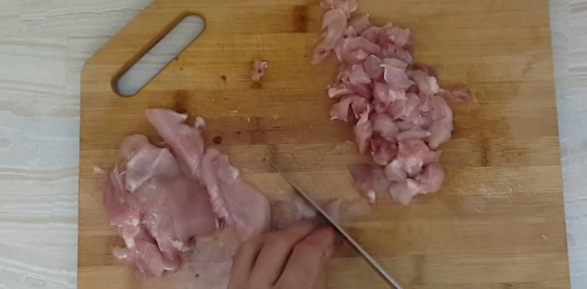 - Курку або свинину нарізати кубиками, гриби - скибочками.