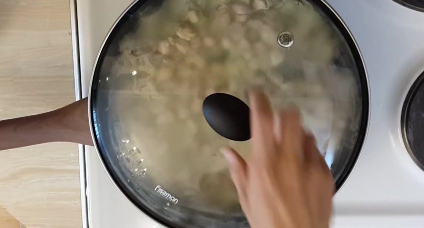 Додати курку. Протушкувати все 10 хвилин, накривши кришкою.![]()