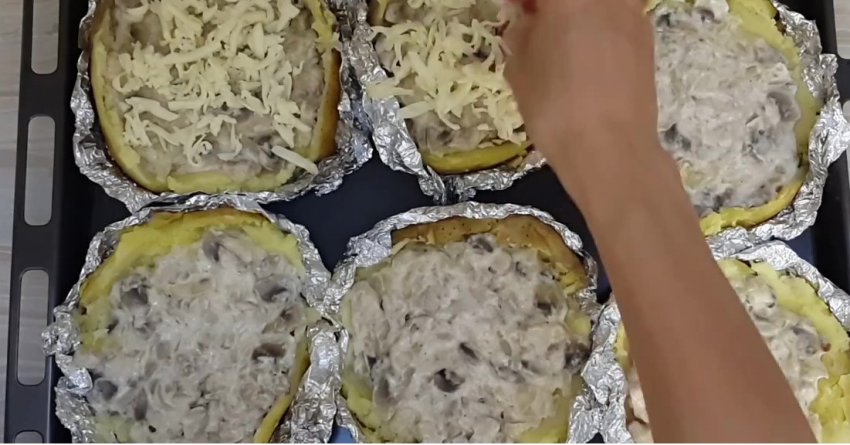 За допомогою фольги навколо картоплі зробити бортики, ложкою розрівняти поверхню. Засипати всередину начинку зі смаженого м'яса та грибів. Так заповнити кожну картоплину. Зверху притрусити моцарелою. Запікати в духовці за +200°С протягом 20-25 хвилин.![]()