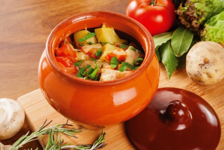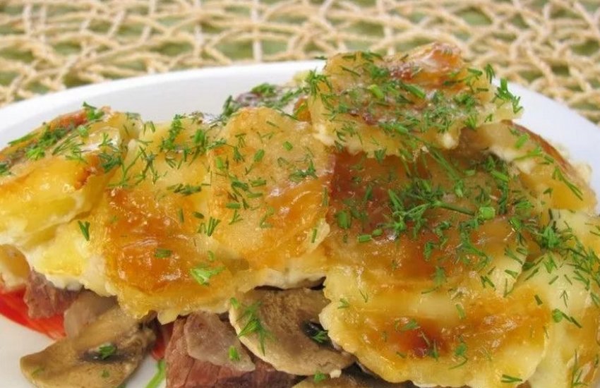 - У глибоку жаровню викласти картоплю, зверху - смажене м'ясо з овочами та гриби. Посолити, поперчити та залити водою. Запікати в духовці за +180°С протягом 90 хвилин. Подавати страву гарячою.