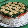 - Обережно зняти кільце. Чайною ложкою промазати боки салату майонезом, потім, трохи піднімаючи тарілку і прокручуючи її навколо своєї осі, обсипати з боків зеленню, що залишилася.