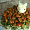 - Перед подачею накрити ємність плоским блюдом, обережно перевернути. Краї тарілки з салатом можна прикрасити петрушкою або іншою зеленню за смаком, яку для цих цілей краще не кришити, а залишити гілочками, щоб здавалося, що "кошик" щойно принесли з лісу.