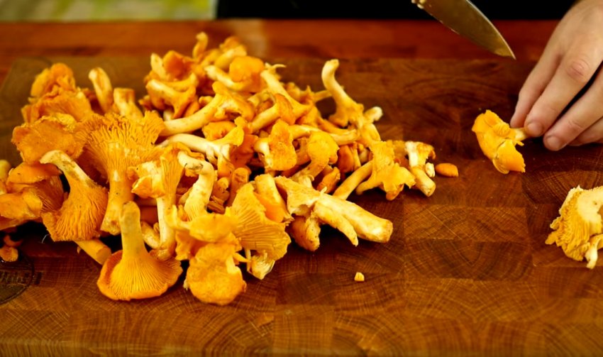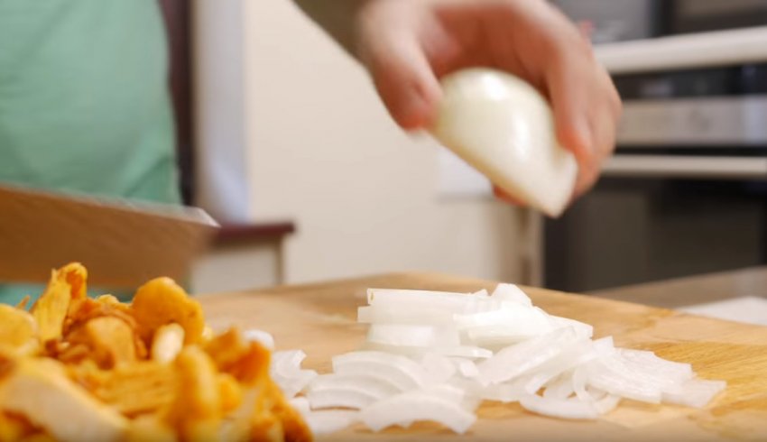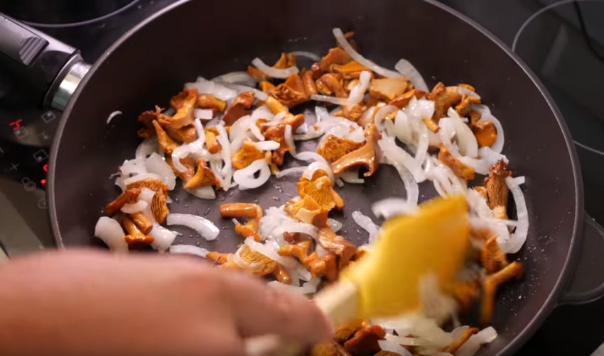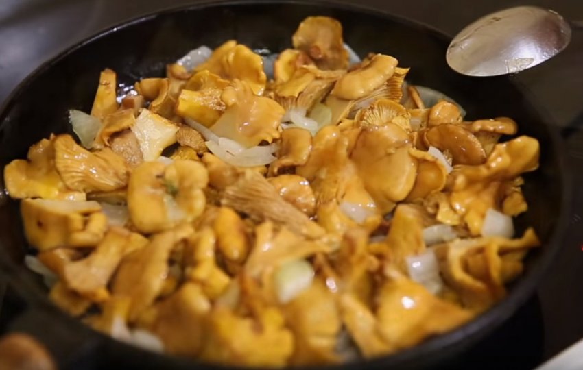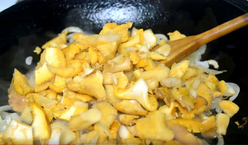 Розрізати великі лисички, ті, що поменше залишити цілими. Додати на сковорідку до цибулі, смажити 10 хв., до рум'яності.![]()