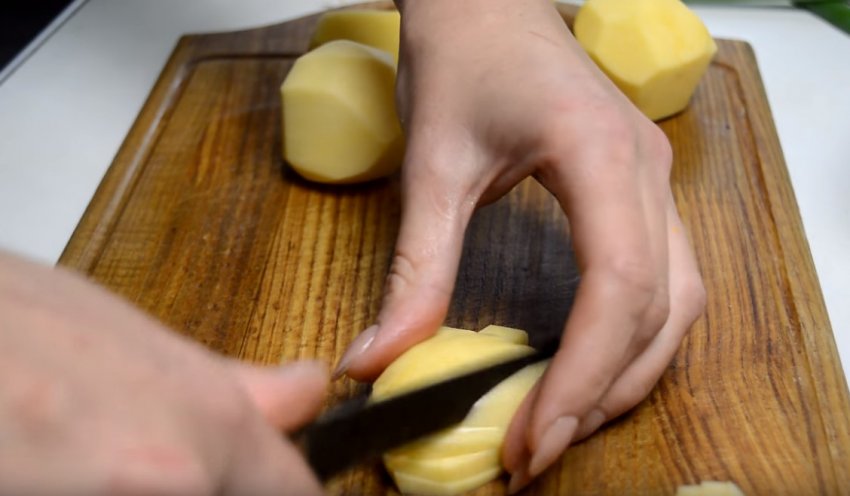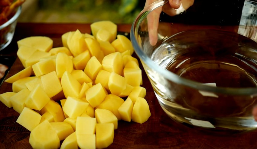 Перш ніж готувати, картоплю рекомендується замочувати у воді, для зменшення крохмалю. Нарізка продуктів - за бажанням: кубиками, соломкою, скибочками.