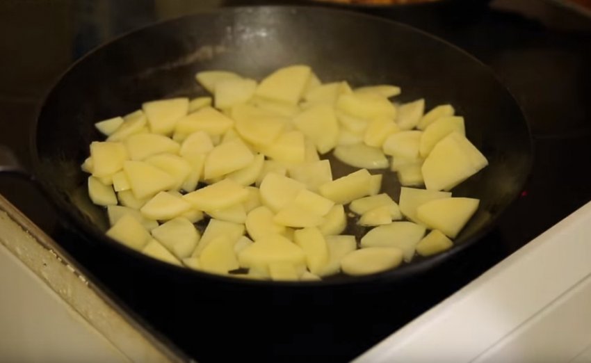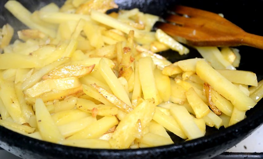 Посмажити нарізану скибочками картоплю на другій сковорідці 10 хв.![]()